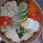 Aardappelsalade, ijsberg, tomaat, geraspte wortelen, gemarineerde rode kool, komkommer, pasta salade saus van de chef, verse tartaar.